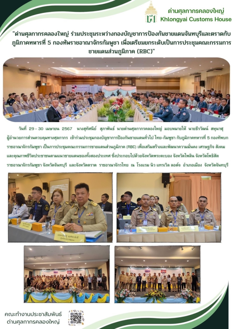 >>> ด่านศุลกากรคลองใหญ่ร่วมประชุมระหว่างกองบัญชาการป้องกันชายแดนจันทบุรีและตราดกับภูมิภาคทหารที่ 5 กองทัพราชอาณาจักรกัมพูชา เพื่อเตรียมยกระดับเป็นการประชุมคณะกรรมการชายแดนส่วนภูมิภาค (RBC)
