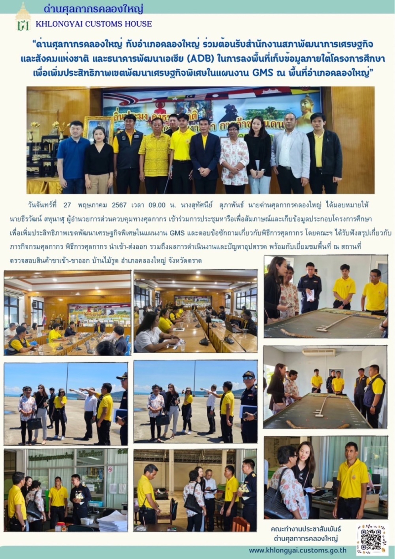 ด่านศุลกากรคลองใหญ่กับอำเภอคลองใหญ่ ร่วมต้อนรับสำนักงานสภาพัฒนาการเศรษฐกิจและสังคมแห่งชาติ และธนาคารพัฒนาเอเชีย (ADB) ในการลงพื้นที่เก็บข้อมูลภายใต้โครงการศึกษาเพื่อเพิ่มประสิทธิภาพเขตพัฒนาเศรษฐกิจพิเศษในแผนงาน GMS ณ พื้นที่อำเภอคลองใหญ่