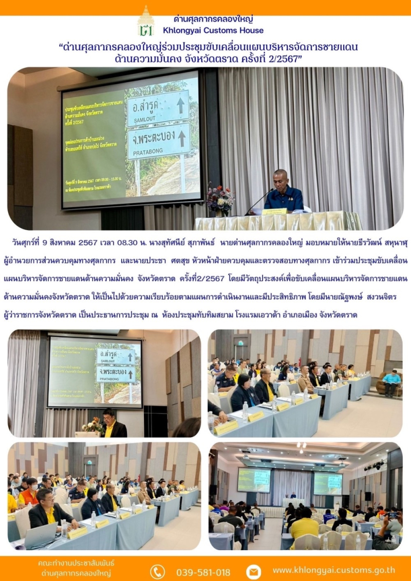 >>> ด่านศุลกากรคลองใหญ่ร่วมประชุมขับเคลื่อนแผนบริหารจัดการชายแดนด้านความมั่นคง จังหวัดตราด ครั้งที่ 2/2567