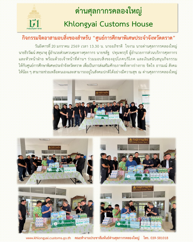 ด่านฯ คลองใหญ่ จัดกิจกรรมจิตอาสามอบสิ่งของสำหรับ ?ศูนย์การศึกษาพิเศษประจำจังหวัดตราด?