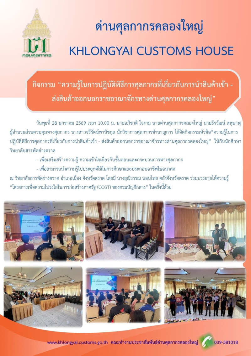 ด่านฯ คลองใหญ่ กิจกรรม ?ความรู้ในการปฏิบัติพิธีการศุลกากรที่เกี่ยวกับการนสินค้าเข้า-ส่งสินค้าออกนอกราชอาณาจักรทางด่านศุลกากรคลองใหญ่?