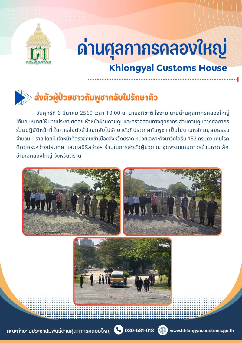 **ด่านศุลกากรคลองใหญ่ ร่วมส่งตัวผู้ป่วยชาวกัมพูชากลับไปรักษาตัว**